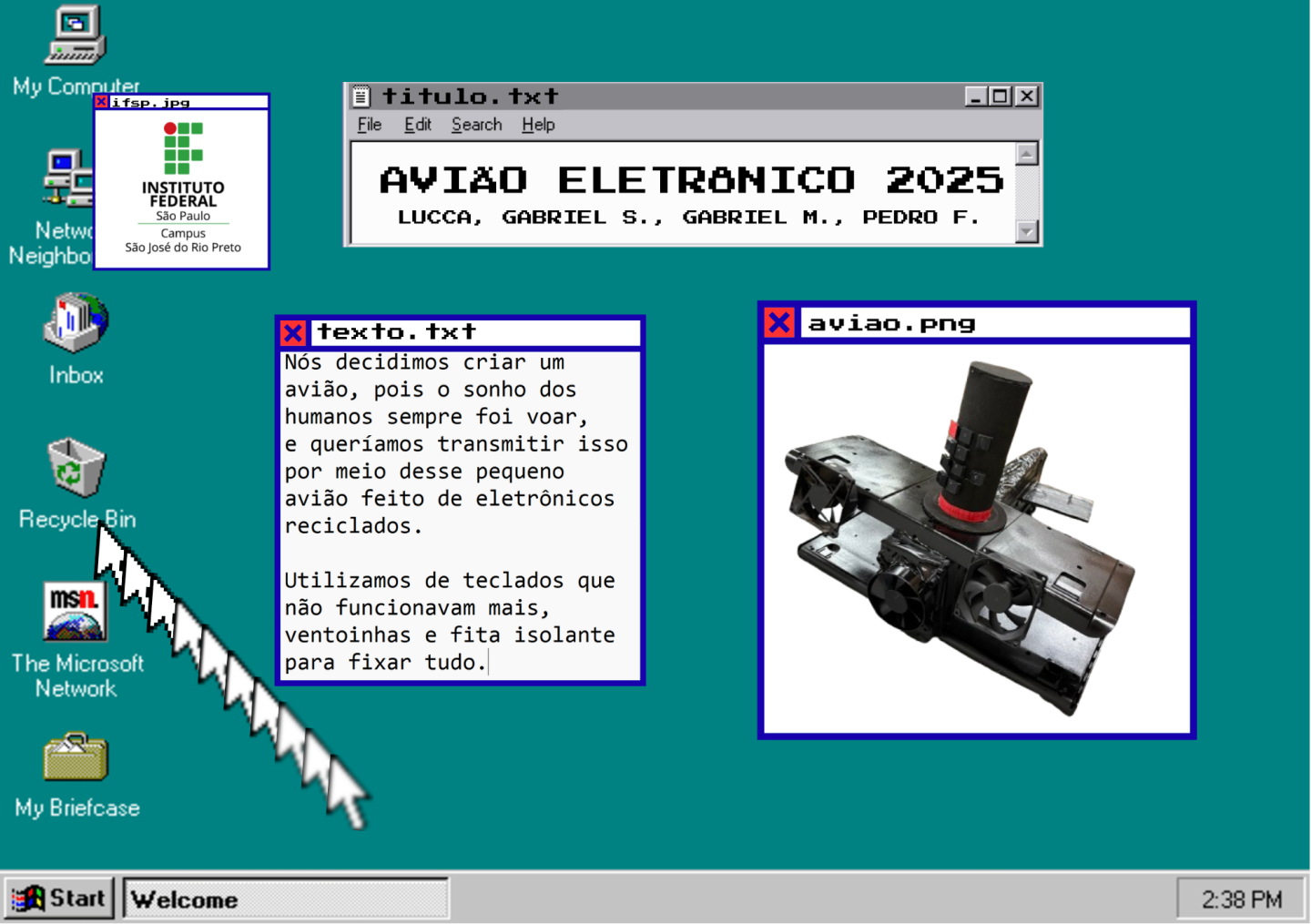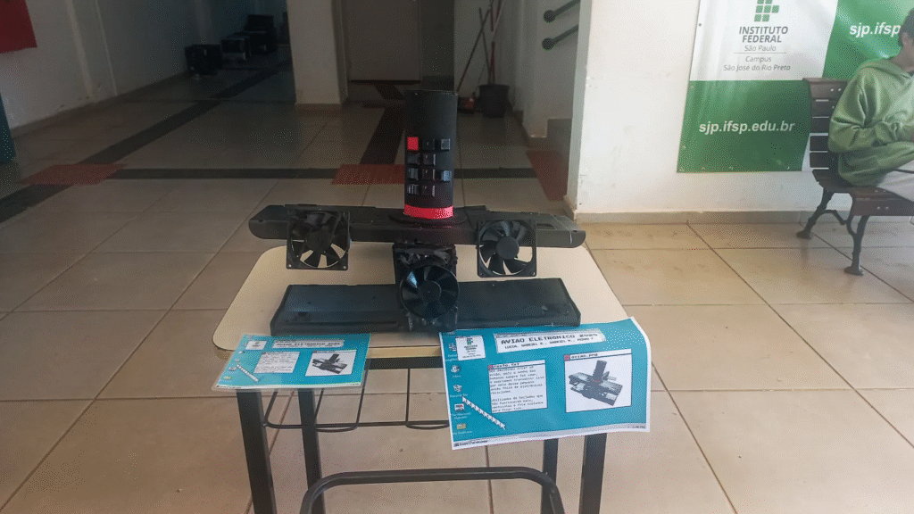 Dia 11 de dezembro, esculturas feitas de sucatas produzidas pelos alunos do Curso de T.I integrado ao Ensino Médio estiveram em exposição no campus. O “Avião Eletrônico” esteve aqui também, um trabalho feito pelos alunos Lucca Goulart, Gabriel Marques, Gabriel Saldanha e Pedro Ferrari.
