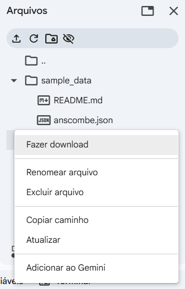 Vamos agora aprender como abrir um arquivo de dados com Python, mas primeiramente, como o Colab organiza isso. Na imagem abaixo é possível visualizar uma pasta, nela já existem alguns arquivos que podemos utilizar para testes, também podemos fazer upload de novos arquivos e abri-los via programação.